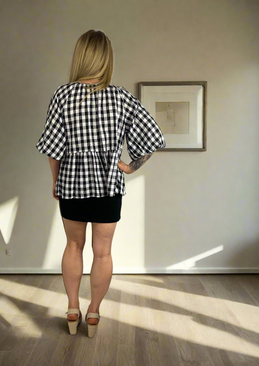 A voluminous gingham print top that is perfectly on-trend for the season!