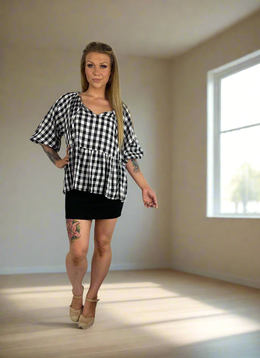 This stylish top is constructed with premium cotton, giving you all the luxuries of a breathable and soft material. The gingham black and off white coloring adds visual interest and provides a slimming silhouette that flatters any figure. The delicate stitching ensures durability, so you can trust that your investment will last for years.