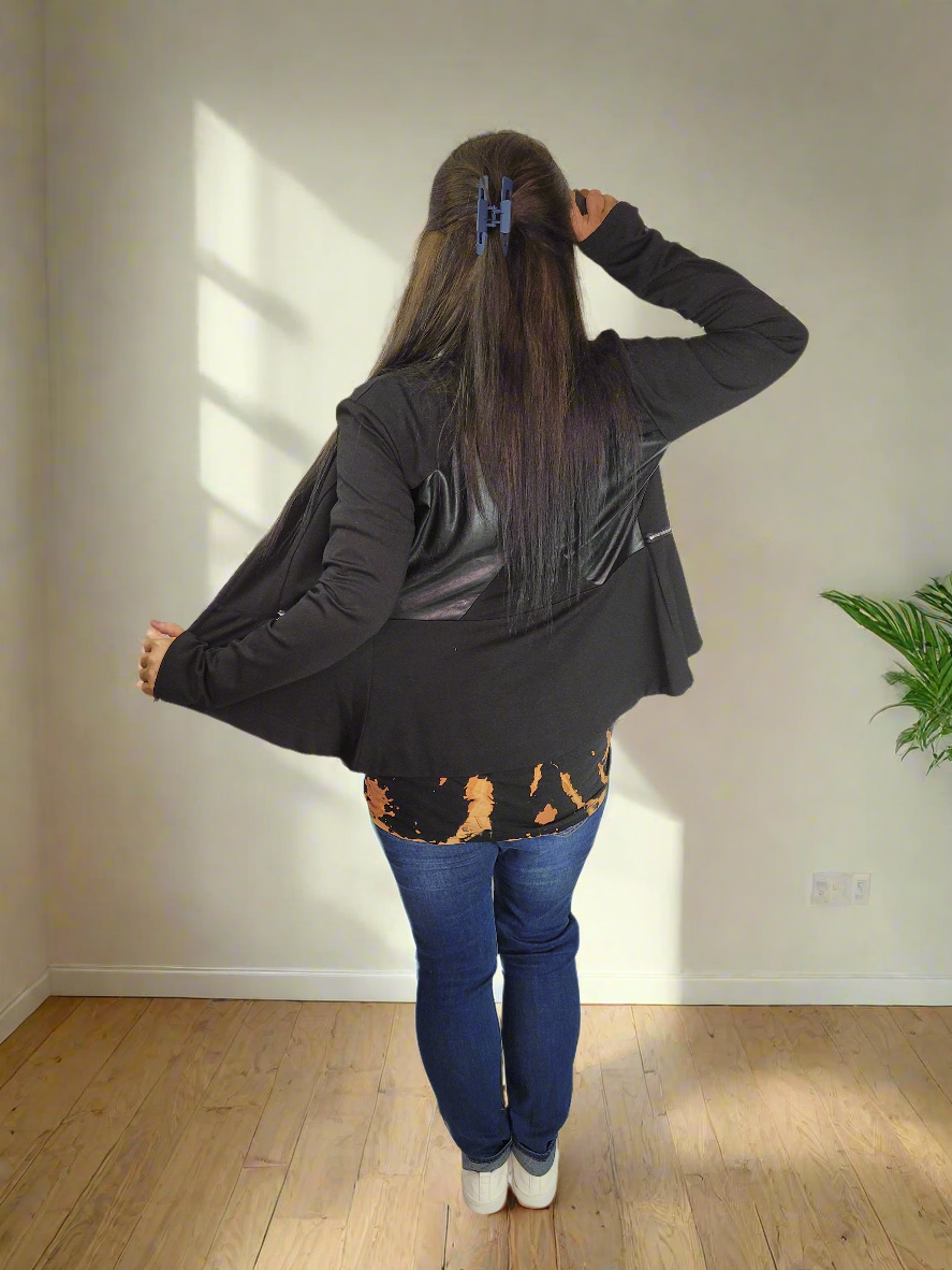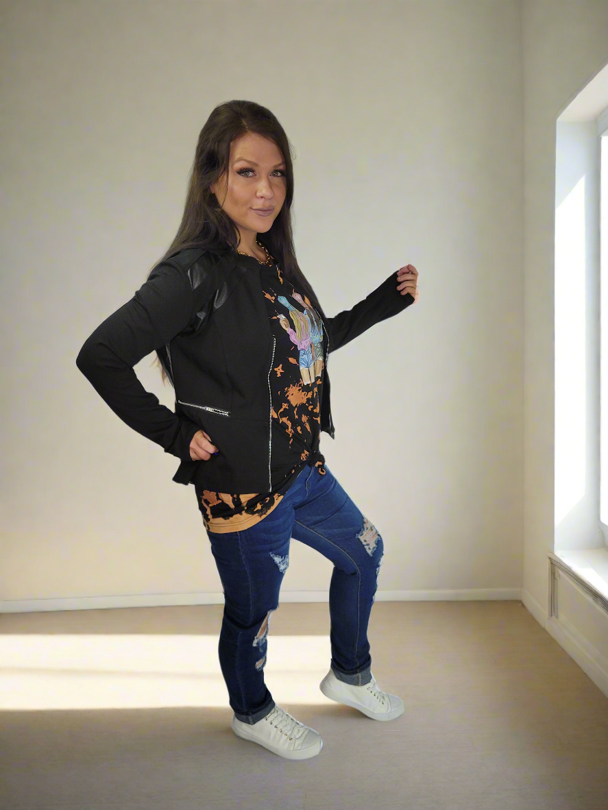 The perfect mixture of leather and soft materials that gives it that perfect fit and look. Pair this jacket with a pair of jeans or a simple dress to make an eye catching look!