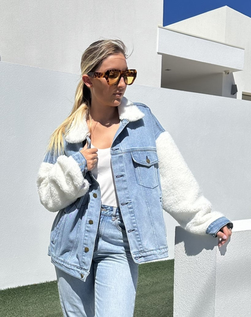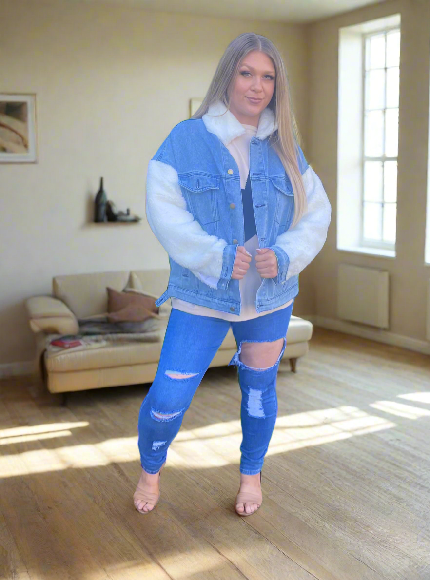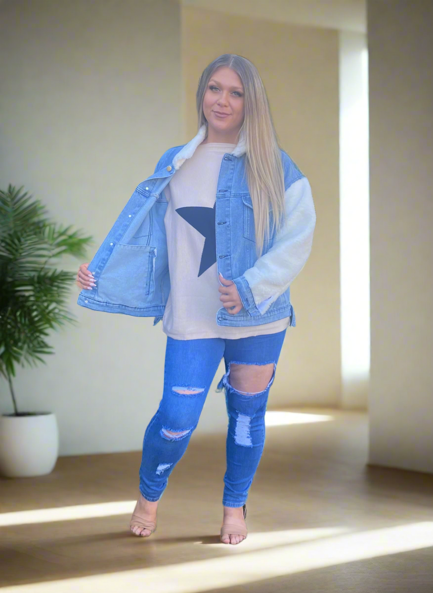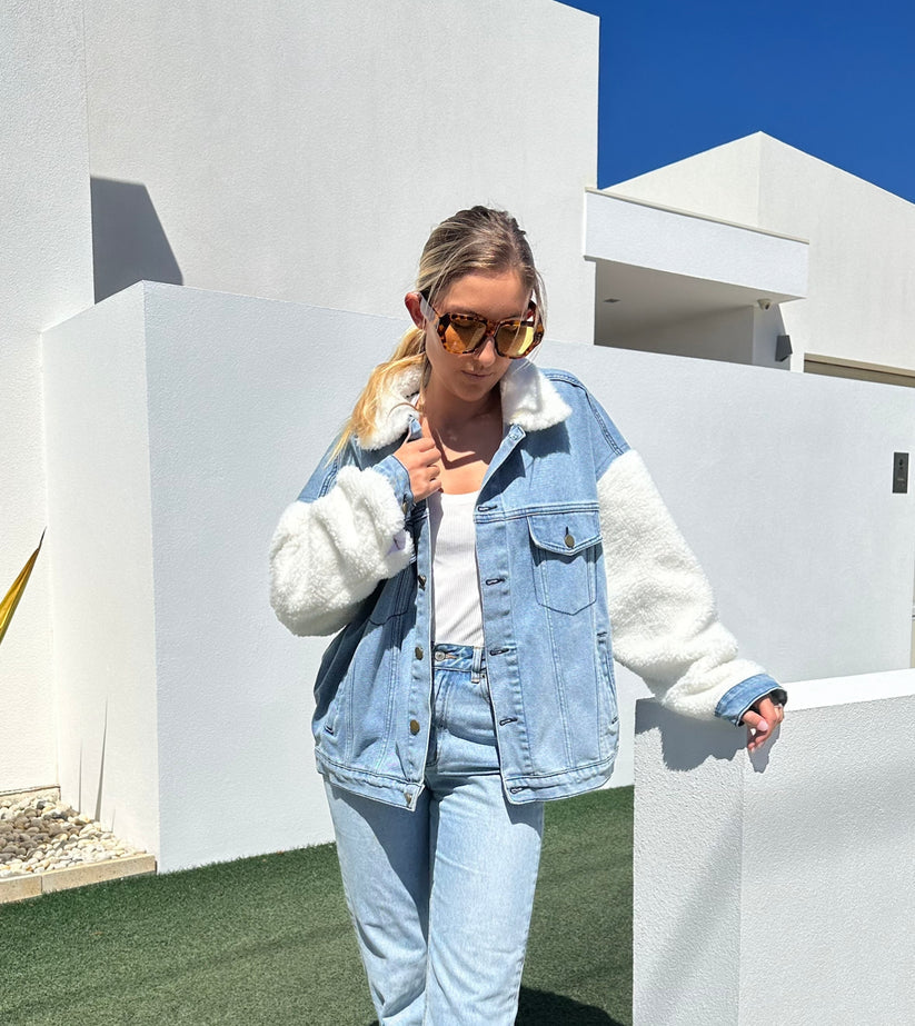 Experience ultimate comfort and style with our Blue Denim Jacket, featuring a soft and cozy white fleece lining.