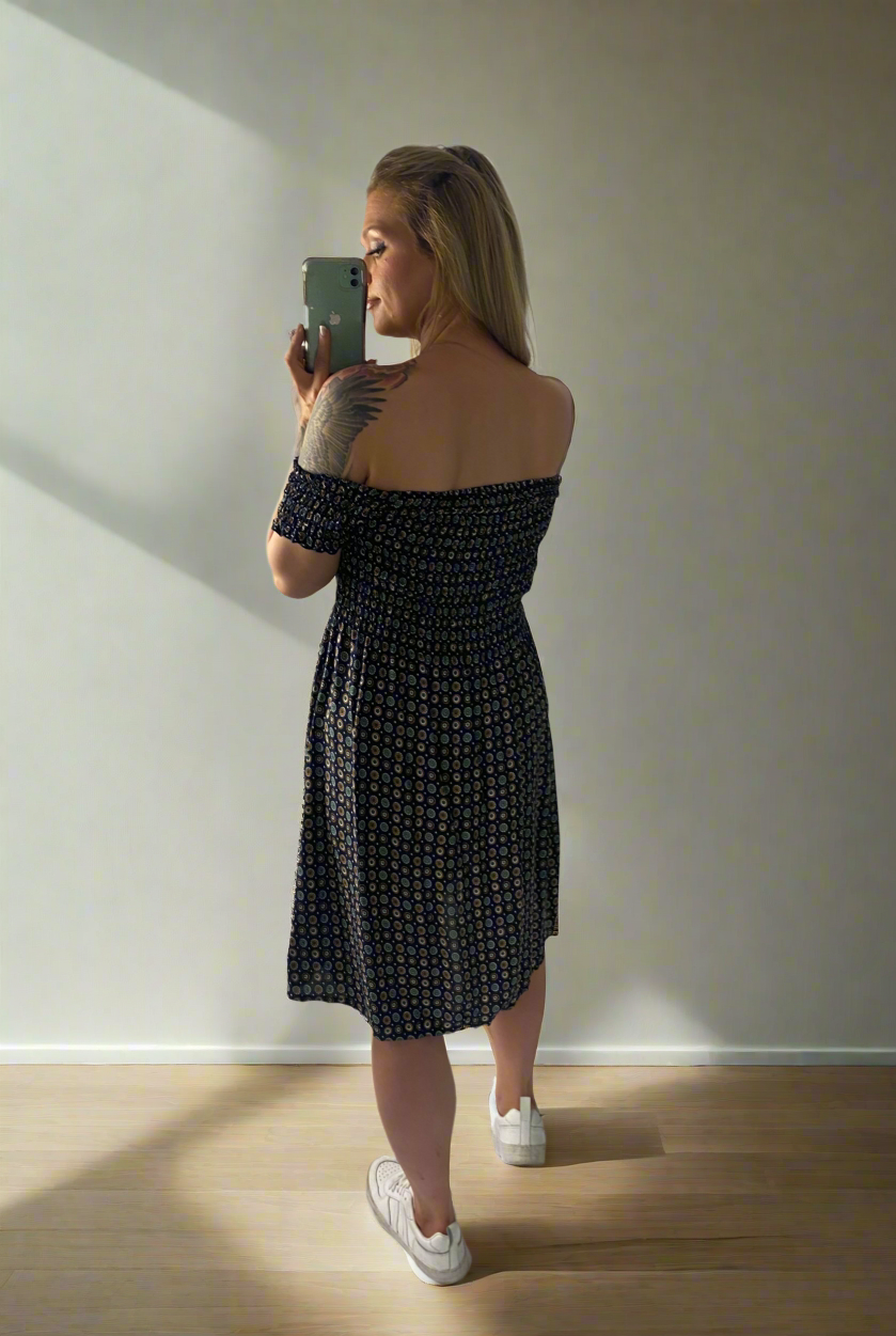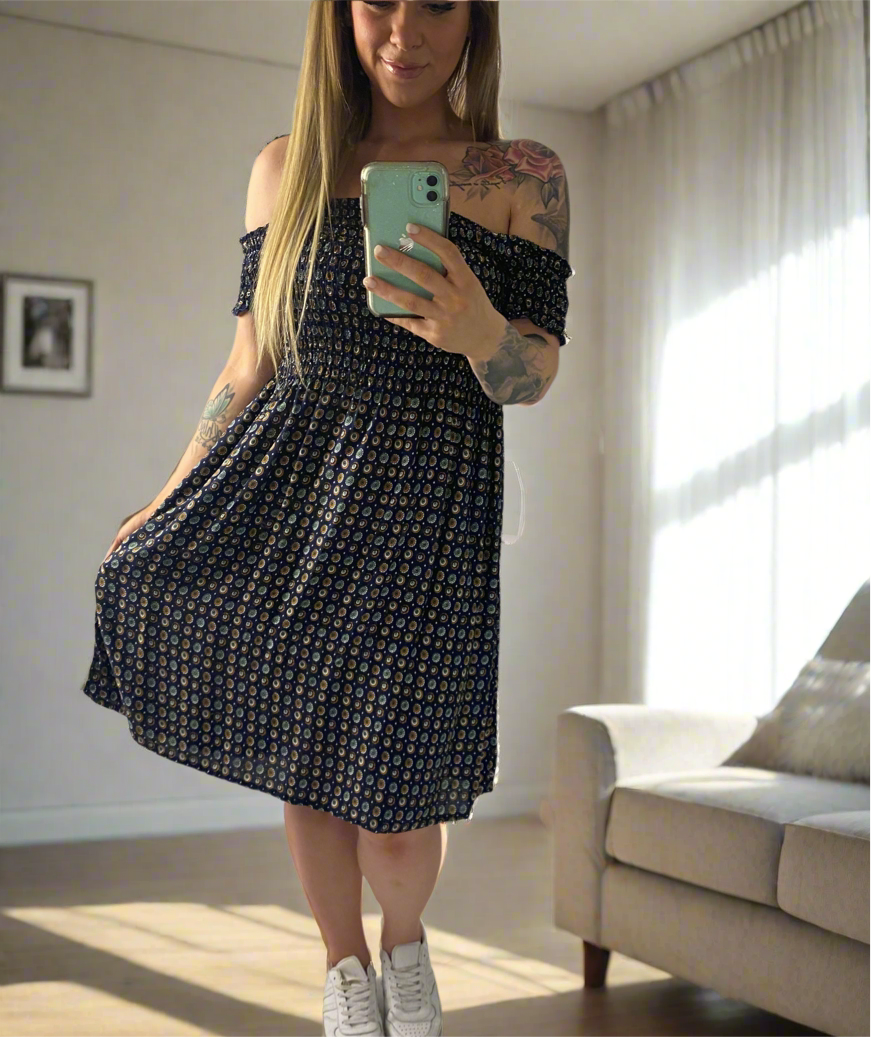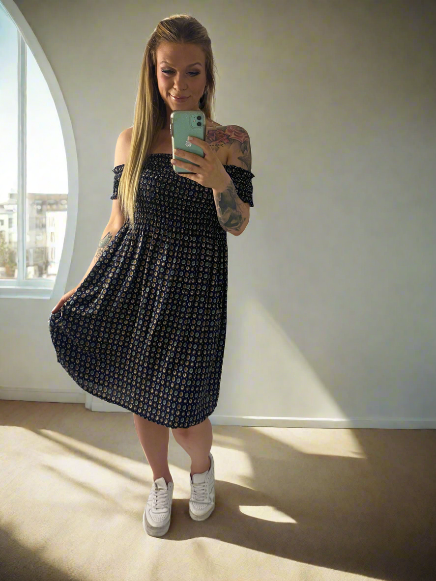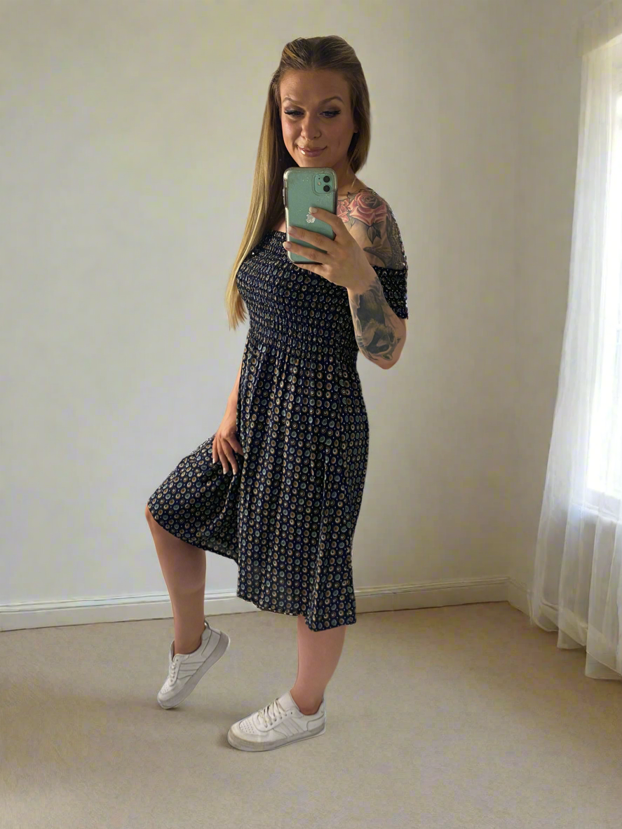 Embrace elegance and style with our 💙 ANNAH Navy Blue Pattern Stretch Dress.