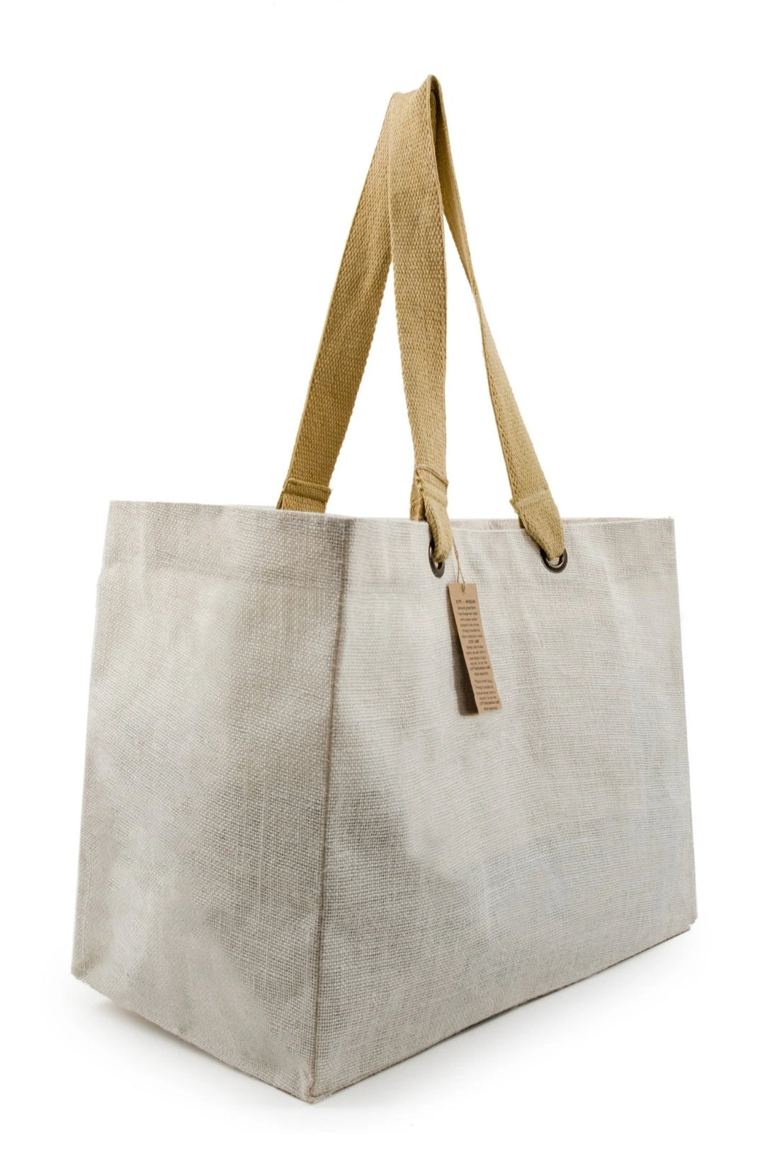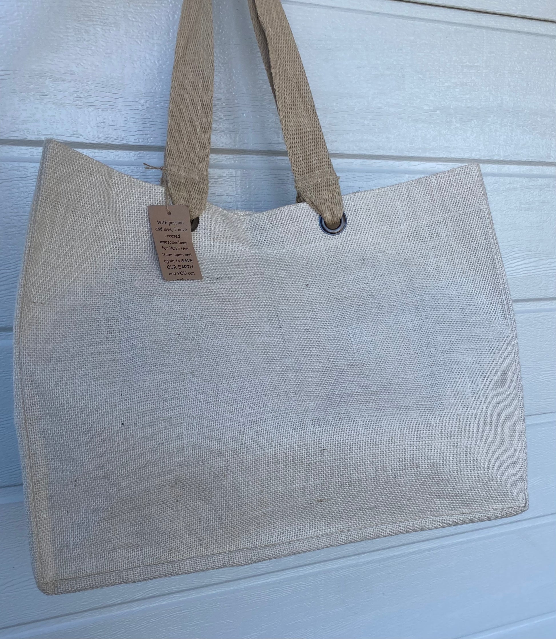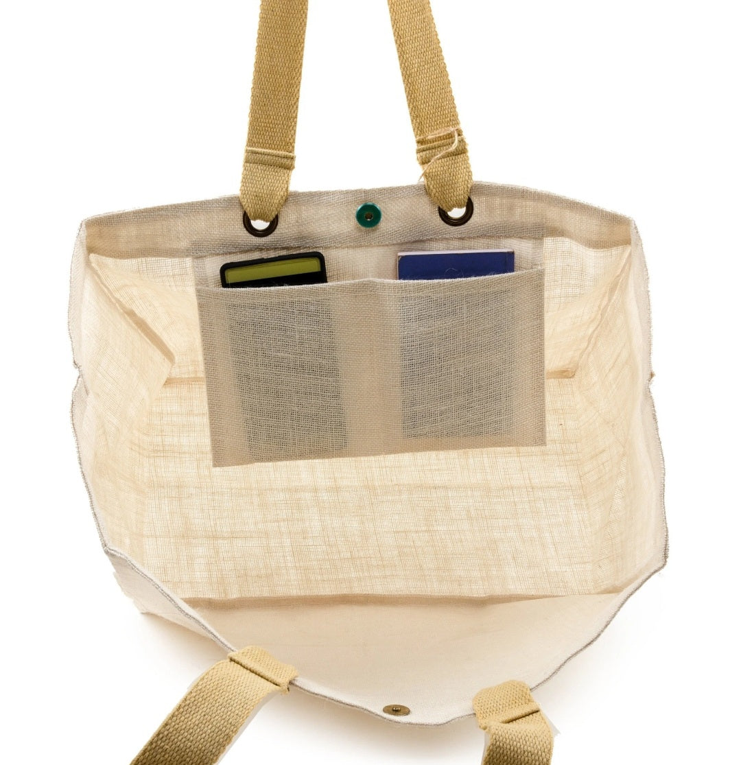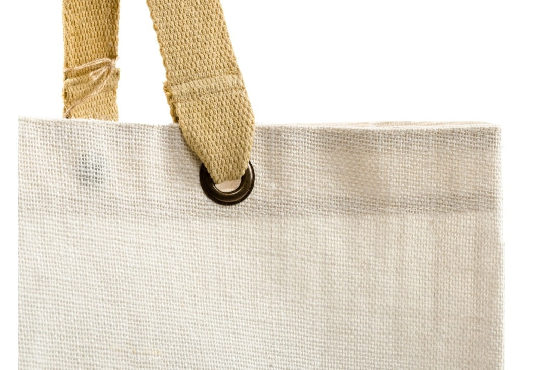 Made from eco friendly premium grade Jute / Hessian this lightweight reusable bag is extremely strong and durable. No harsh chemicals used in dyes. Long cotton tape handles for your comfort with internal pocket for easy access to phone / keys.