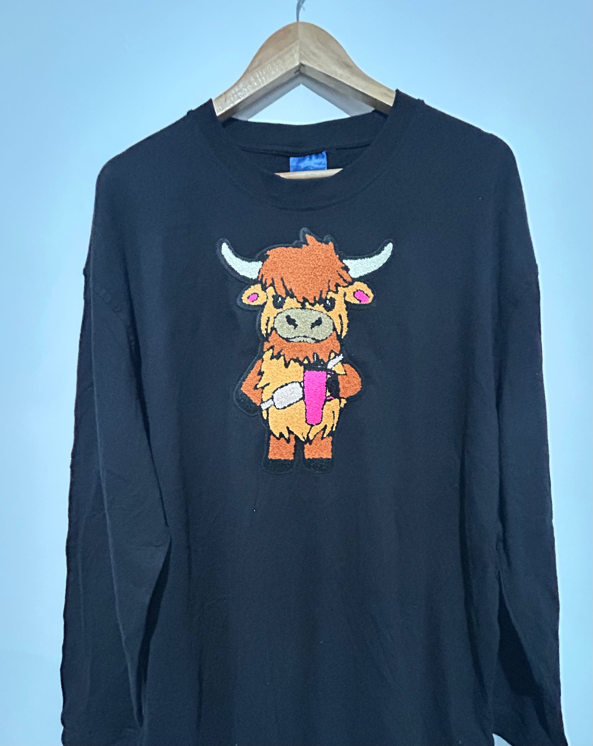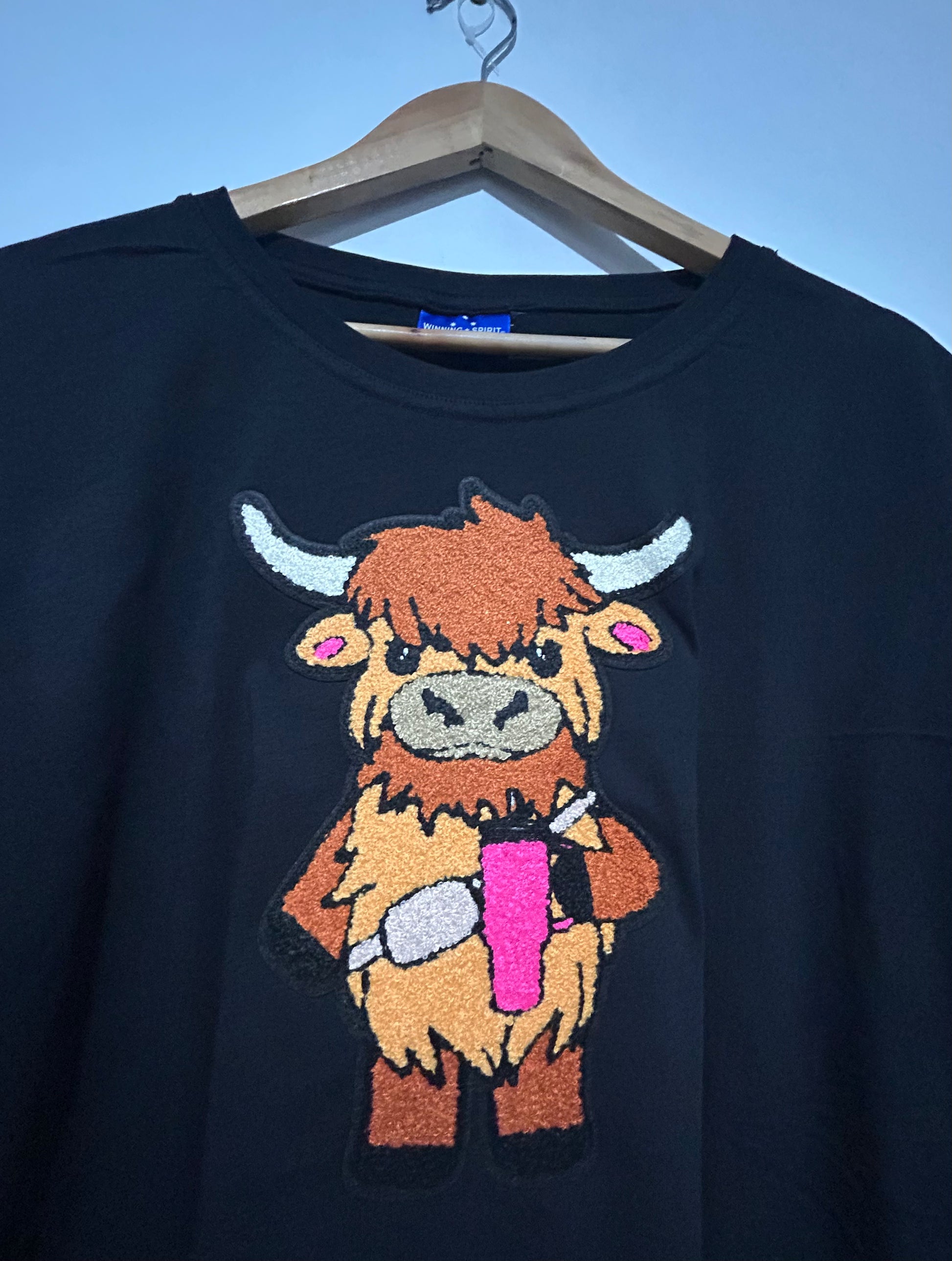 Experience the beauty and charm of the Scottish Highlands with our handmade T-shirts featuring a charming Highland cow holding a tumbler.