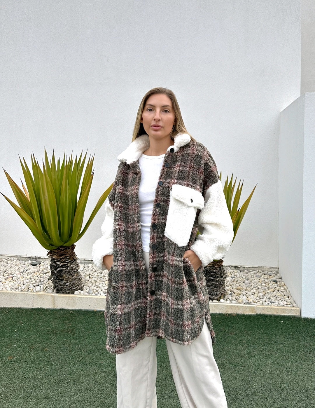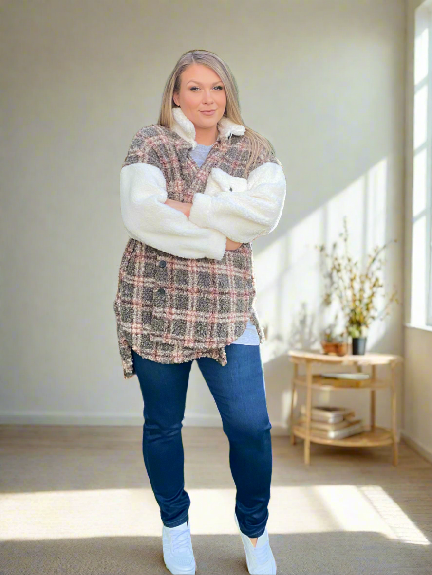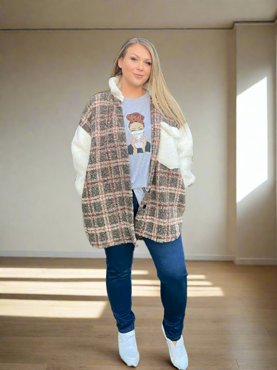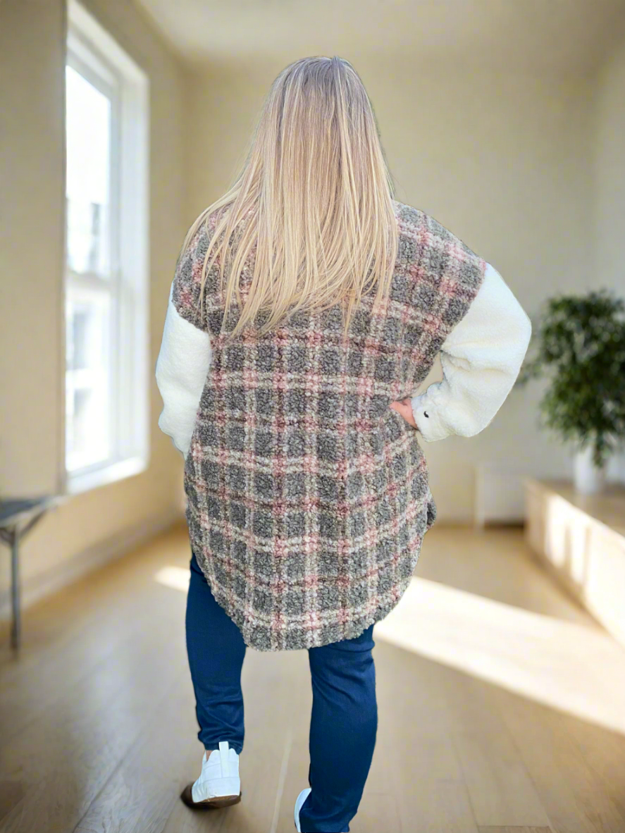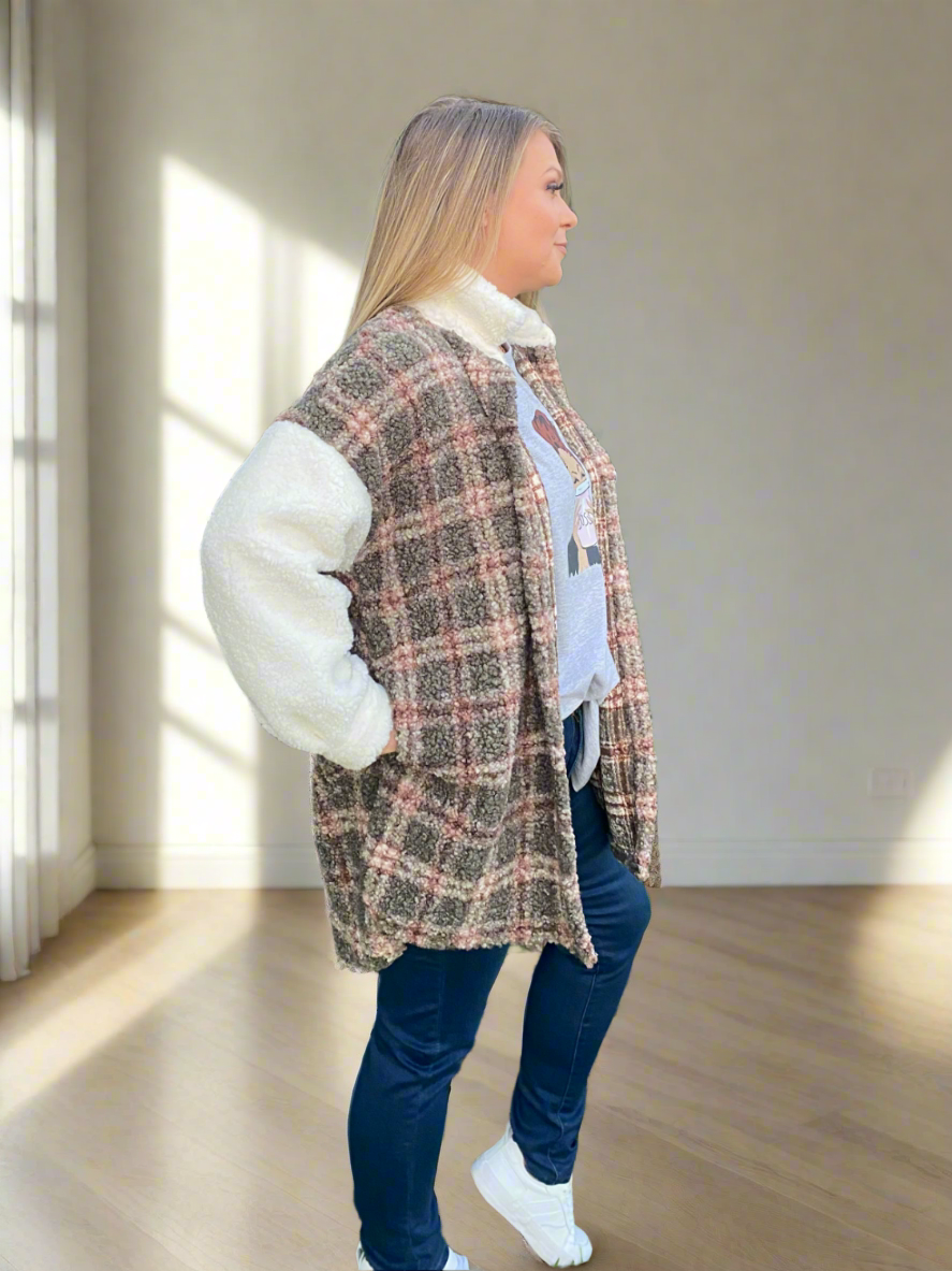 Khaki and White Fluffy Shacket Sweater