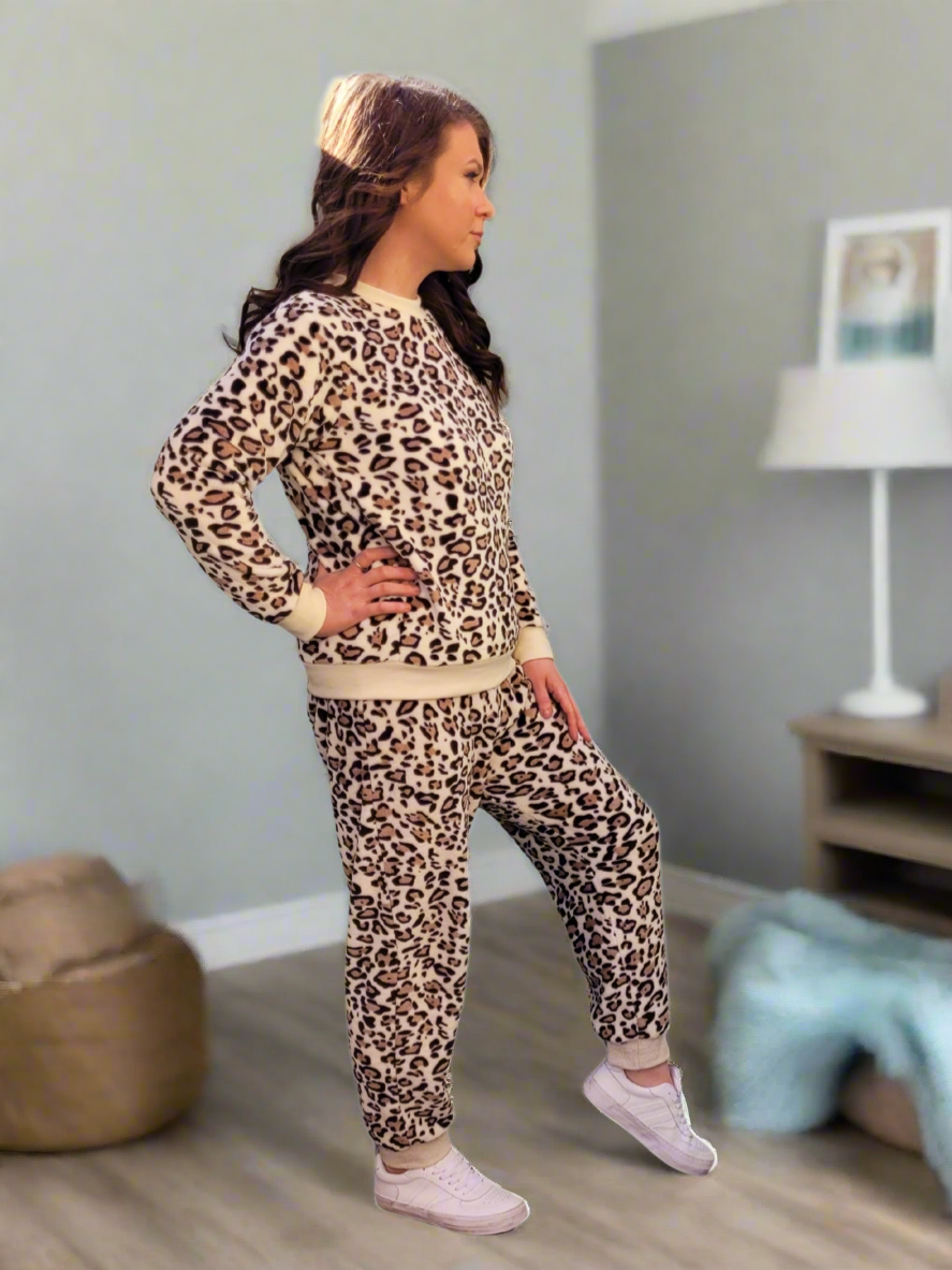 LACEY Mocha Leopard Cuffed fluff Lounge Wear Set
