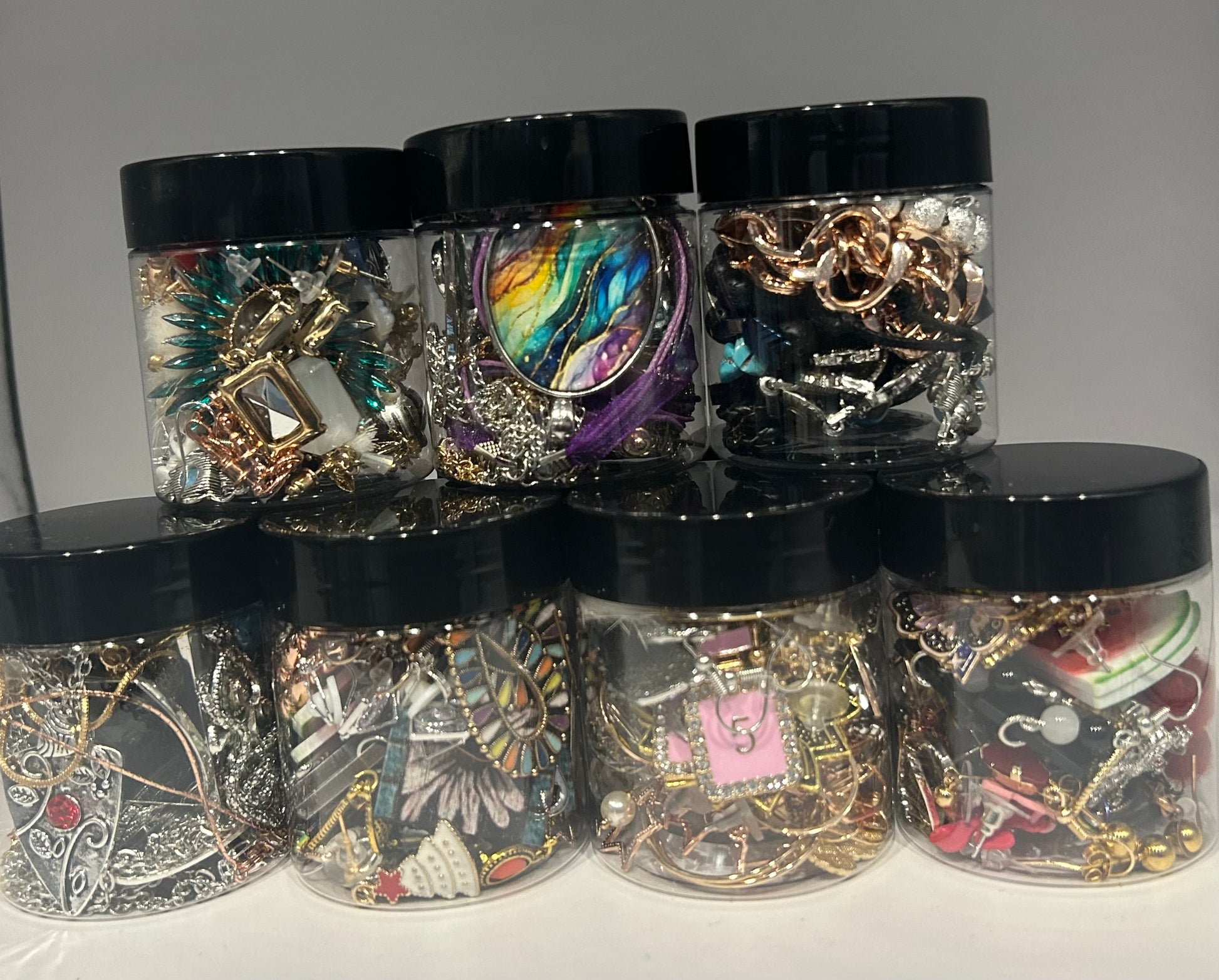 MIXED JARS HAVE jewellery of all kinds Including necklaces, bracelets, rings, earrings and not limited to nose and belly bars etc , hidden gems, Charm style beads, pins and broach’s & small hair accessories may be included. (ALSO AVAILABLE IN MEDIUM)