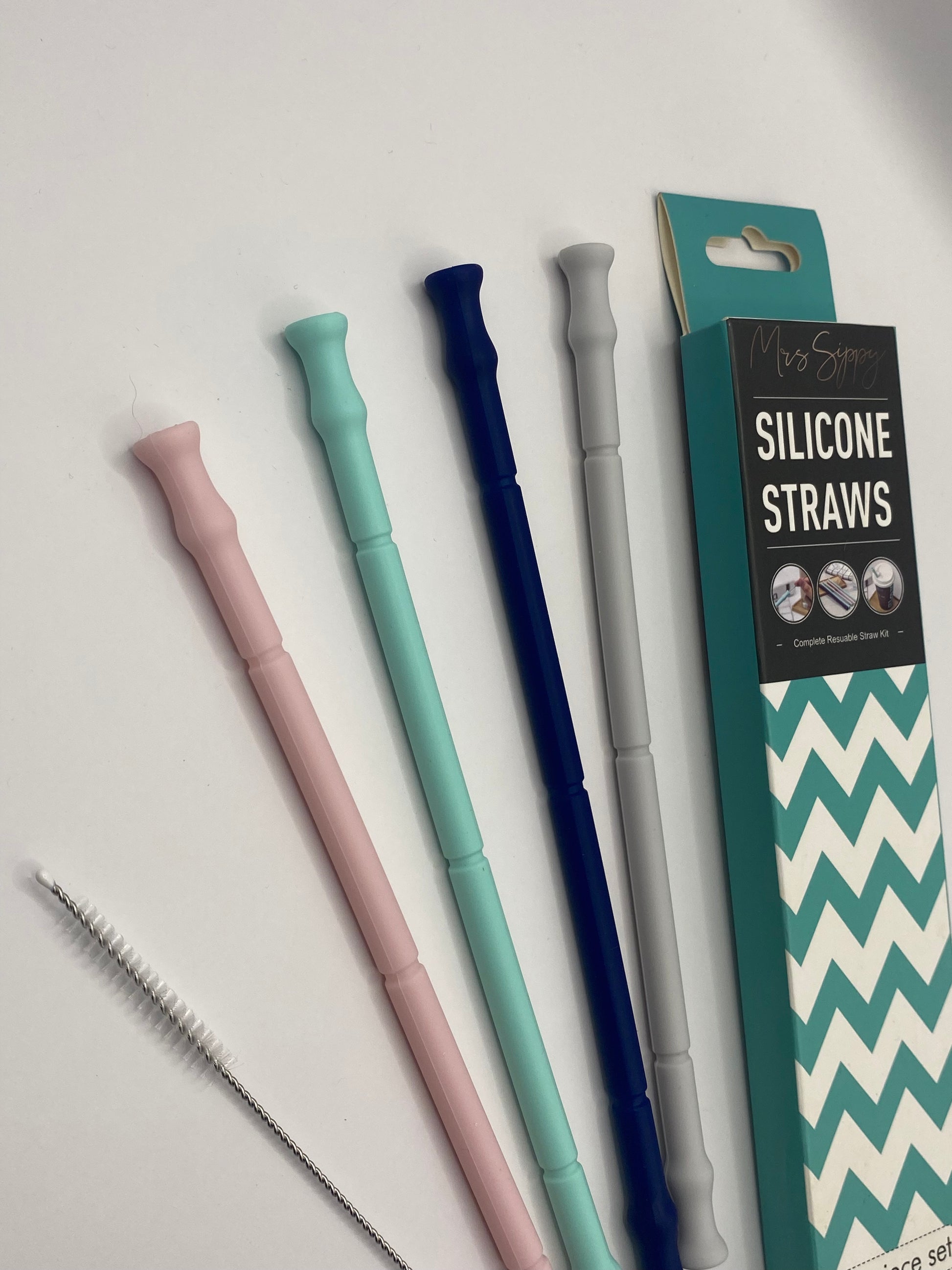 X4 Re-Useable Silicone Drinking Straws + Cleaner Brush